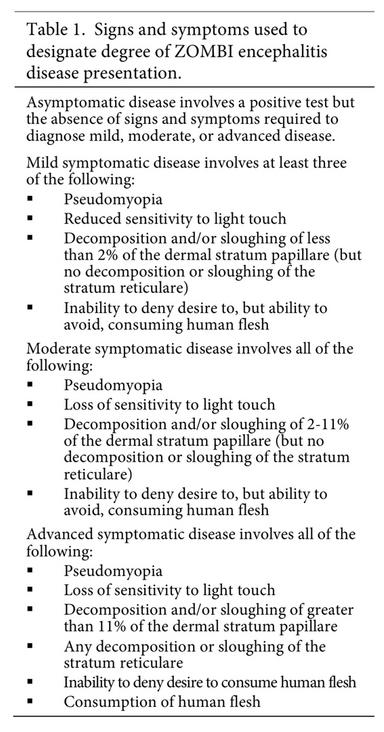Postmortem examinations revealed significant alimentary canal differences in individuals testing negative and positive for Zooanthroponotic Occult MetaBiomimetic Infectious (ZOMBI) Encephalitis. On the tongue, benign migratory glossitis was documented in 1.1% of ZOMBI encephalitis- negative subjects and 43.9% of ZOMBI encephalitis-positive subjects. Semicircular extensions of submucosa resembling plicae circulares normally limited to the small intestine were found in the esophagus in 2.7% and stomach in 7.5% of ZOMBI encephalitis-negative subjects, but in the esophagus in 88.4% and stomach in 77.7% of ZOMBI encephalitis-positive subjects. Villi were the most numerous in the duodenum, jejunum, and ileum of ZOMBI encephalitis-negative subjects, where they were reduced in ZOMBI encephalitis-positive subjects but the most abundant in the esophagus and stomach. The stomach was longer and the jejunum, ileum, and caecum were shorter in ZOMBI encephalitis-positive subjects. ZOMBI encephalitis-positive subjects also exhibited inflammation of the lamina propria of the small intestine and greater capillary infiltration of the esophagus and stomach. The colon was empty in 47.9% of ZOMBI encephalitis-positive subjects and 35.2% of ZOMBI encephalitis-negative subjects. Increasing in magnitude with disease progression, these differences may reflect modifications in nutrient absorption related to dietary changes, decreased function in the small intestine, and/or alterations in digestive efficiency in ZOMBI encephalitis-positive individuals, and may be considered for inclusion in the diagnosis and staging of ZOMBI encephalitis.